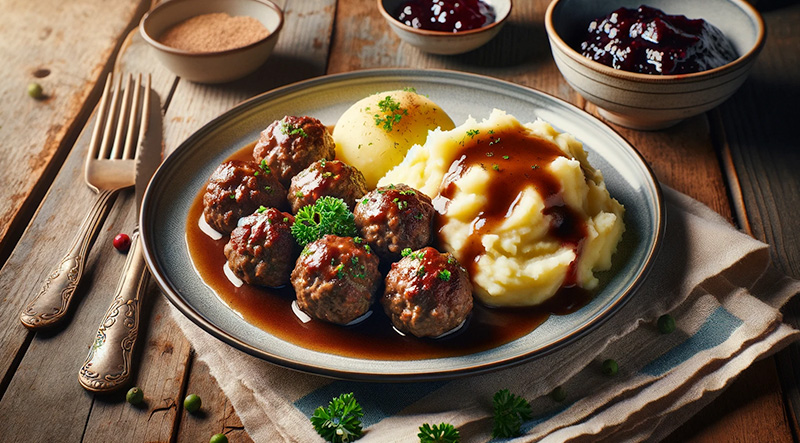 The meatballs are typically fried in butter, giving them a brown and slightly crispy exterior, while keeping the inside tender and juicy. They are often served with creamy gravy, boiled or mashed potatoes, and a traditional Swedish lingonberry jam. This combination of savory meatballs, rich gravy, and the sweet-tartness of the lingonberry jam creates a distinctive and beloved flavor profile.